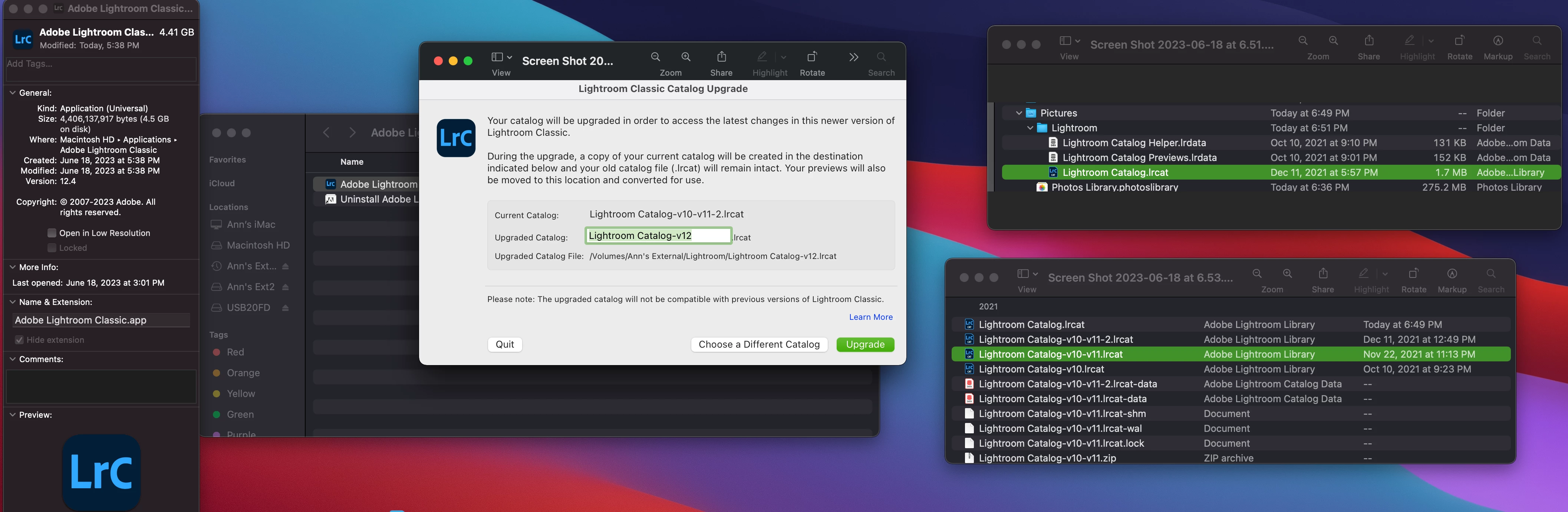 When I re-started LR, I got a message that the catalog needed to be upgraded. Fine, I've done that before, no big deal. Picked the correct catalog and upgraded to V12. When LR opened, I'd lost 2 years worth of photos... I don't know what catalog it updated but this obviously was a major 'uh-oh' moment and a problem. Tried several times to pick another catalog to load, but the only option I keep getting is to upgrade a catalog. I don't want to do this, I want to cancel any catalog upgrade and load the correct catalog first, and then upgrade once I've seen all the photos are there. There seems to be no way to cancel the upgrade other than a force-quit (I'm on a MAC). I trashed all instances of V12 in hopes that LR would just work like it always has and find and load my last catalog with all of my photos. But it still is requiring a catalog update to open and there is no option to cancel and just load the catalog and update later. I can't figure out how to do this, can someone please help? My version of LR is 12.3, which was updated April 29. Oddly enough, I experienced a power outage of 4 days after I last updated LR due to storms and was able to restart with no problems afterwards. This last outage had seemingly no reason and came back on within a few minutes but wow this situation is new. Sorry for the mini-rant within the question, I'm hoping I'm stressing for no reason about not seeing 2 years of photos and there is a solution, also wondering why there is no option to cancel/delay a catalog upgrade when LR hasn't even loaded yet in order to check/backup first. 😞 Thank you so very much all in advance.