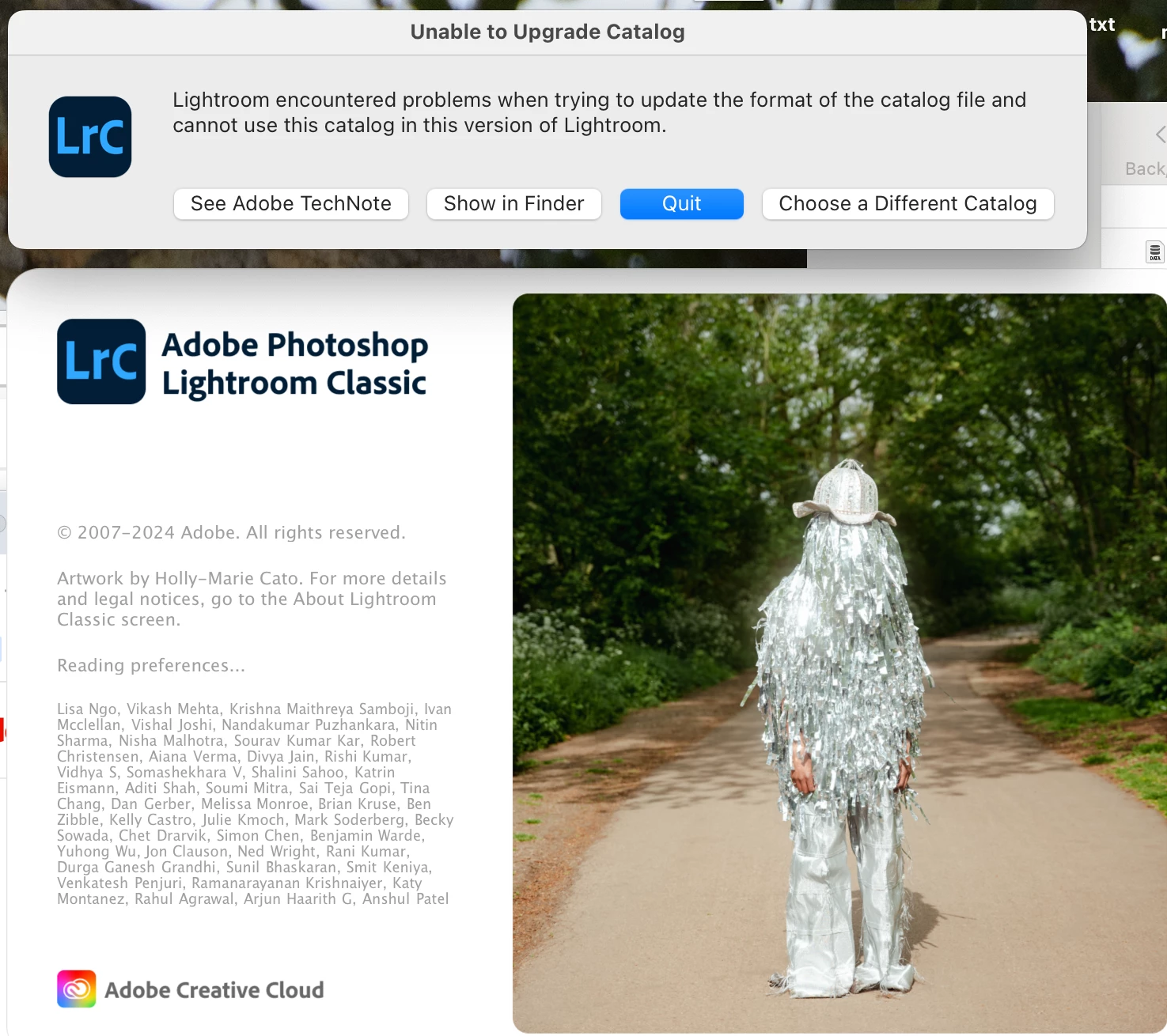 I have an old mac and Lightroom Classic 14.0.1 is not compatible with it. I would like to use Lightroom Classic 13.5, which previously worked on my computer. However, despite installing 13.4, when I go to open it, it attempts to do a catalog upgrade "to access the latest changes in this newer version of Lightroom Classic" and I have no option for avoiding this (my options are update, choose a different catalog, or quit). When I click "update", I get a system error that then quits the app. Any thoughts on how I can get this working again?