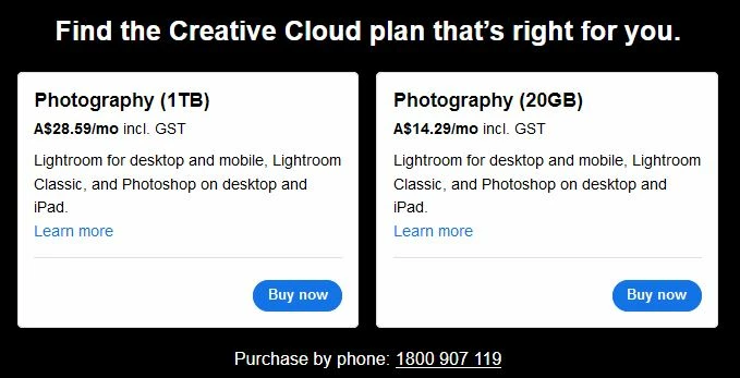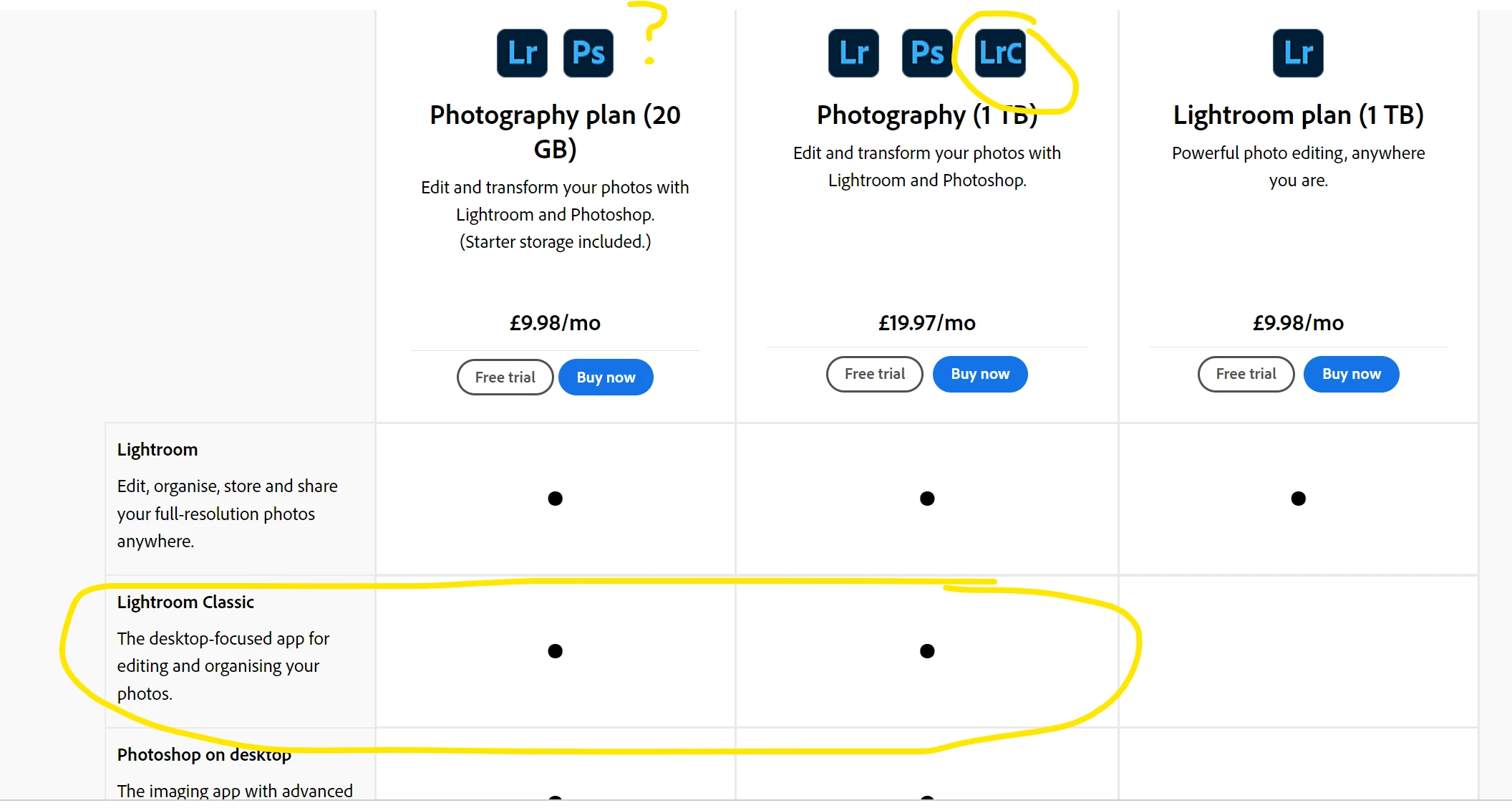 Can someone confirm whether the 9.99 photography plan includes Lightroom Classic? The website (at least the UK version) is unclear, as per the attached image