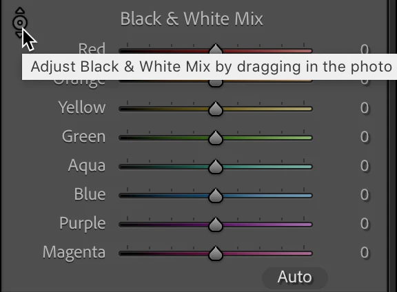 What you need to do is go into the B&W Mix Panel and click on the little icon in the upper left corner. (See the arrow in the screenshot below)