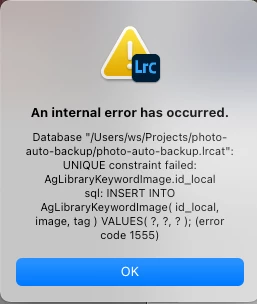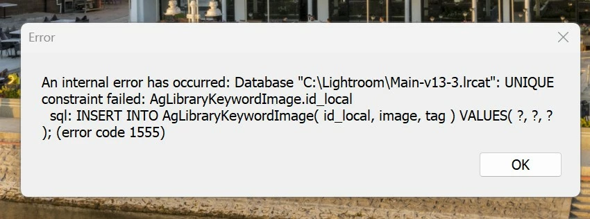 I have a few thousand photos from a vacation that I am trying organize. In the library module, I enter text on the caption field and sync them across multiple images. From time to time I would run into the 'unqiue contraint' error (seen screen shot). It happens frequently and the only way around is to restart lightroom. I have seen this error before and normally happen every once in a while. It seems to have gotten worse with the latest version of lightroom. The catalog is brand new, created just for this set of vacation photos. Does anyone know a way to fix this annoying error? On macos with latest lightroom (auto updated).