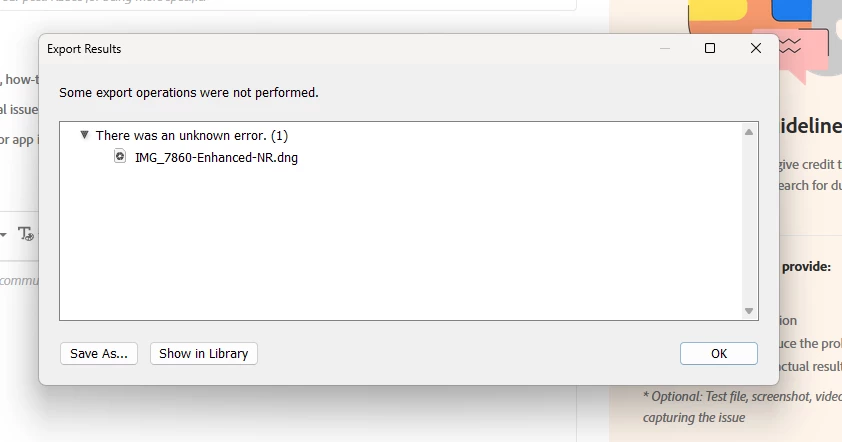 Hello, I am having a problem error show up randomly when I am trying to export different photos. I messaged with a person on the Adobe Instagram for a few hours yesterday trying to fix the problem. They had me do everything under the sun in lightroom to hopefully find the problem. I was told to post here, for expert help. I attached a screenshot of the error message, I tried to attach screenshots of my messaging with Adobe on Instagram but it is not allowing me to attach them.