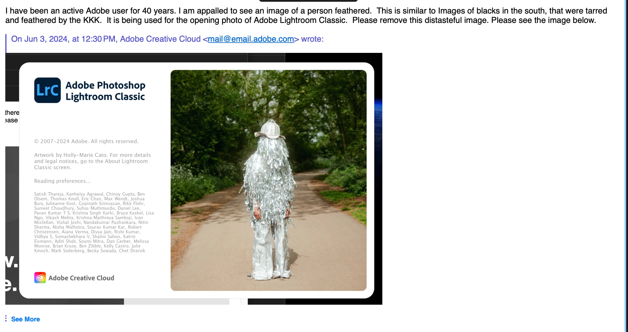 Hi - I have a bad reaction every time I use Lightroom because of the new opening image. I find it to be reminiscent of the 9/11 Falling Man. When I see it, my heart races and the image is disturbing to me. Does anyone else have this reaction?