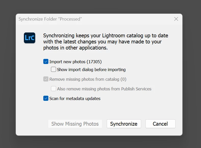 I have a folder with an archive of old weddings, but on first import, Lightroom only imported 6000 of the 23000 images. When I right-click>synchronize on the archive folder, Lightroom tells me there are 17,000 new images.