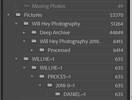 As you can see above, there is the original "processed" archive where some images are, and the strange new one Lightroom has added with the ~ signs.