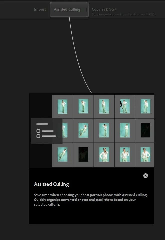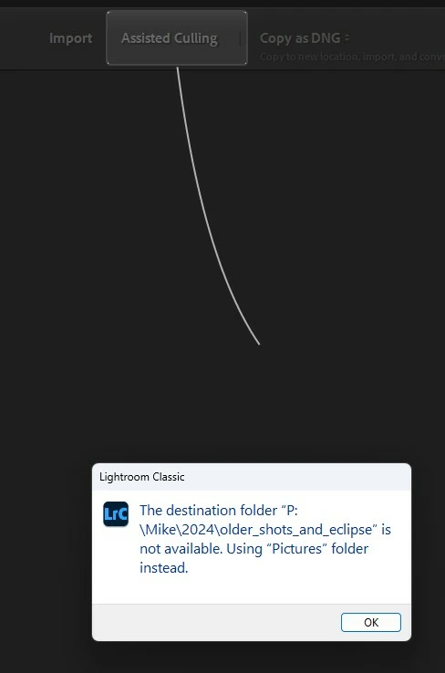 I recently had to move my photos folder from one place to another (old drive died, copied files from a backup to a new drive). At the same time I updated to the latest Adobe, that now has assisted culling for example. Main catalog updated fine, was able to view photos etc. Then I tried to import. Since it's a new version of adobe it's now showing me the new fetaures.. in this case assisted culling. No problem, click on the X to close the dialog.. nope.. hmm.. I can't click anywhere to get rid of the dialog. Thought maybe adobe crashed, so i clicked on another window and low and behold there's another dialog behind the culling sample one.. it's showing that the old destination folder no longer exists, which is true. Ok, click on Ok. Nope.. instantly the culling dialog is back.. so now I'm stuck. I can't close the culling dialog, and I can't close the missing destination folder dialog. I can only kill the process..