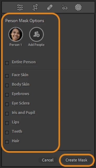 Once you've selected a person, you can further decide what specific parts of the person you want to make adjustments to. You can even use Add People to add other people to the same mask before you create this mask. Select from Face Skin, Body Skin, Eyebrows, Eye Sclera, Iris and Pupil, Lips, Teeth, Hair, or the Entire Person & click on Create Mask.