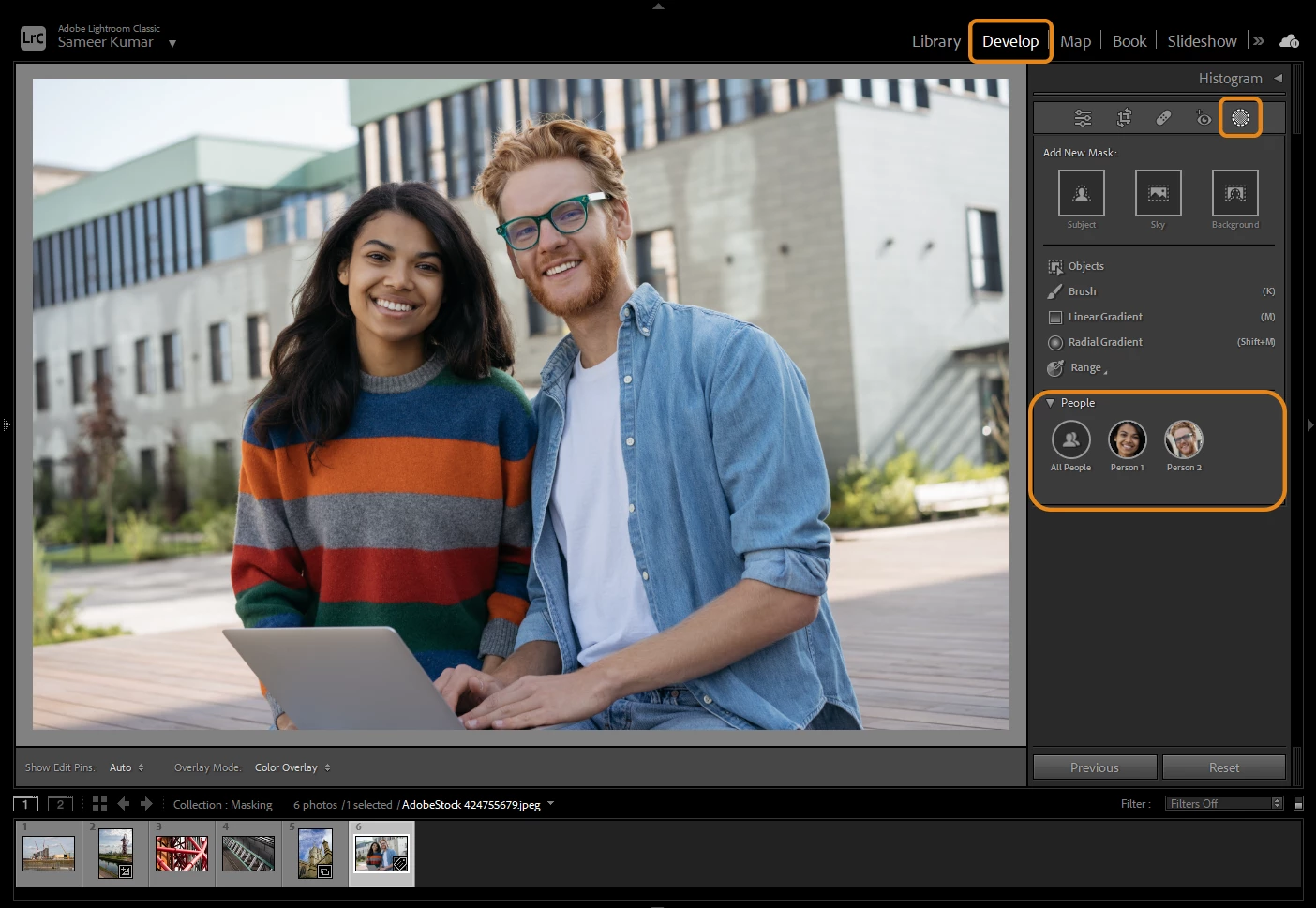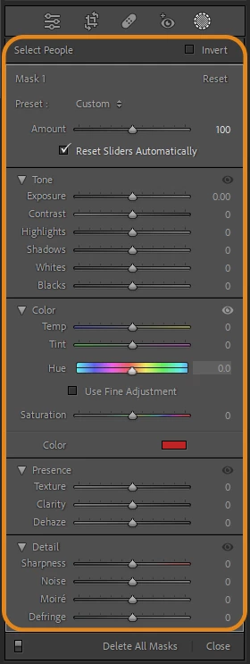 Lightroom Classic will automatically detect all the people in the photo. You can select All People or the person in the image you want to make adjustments to & a Red overlay (by default; can be customized) will appear.