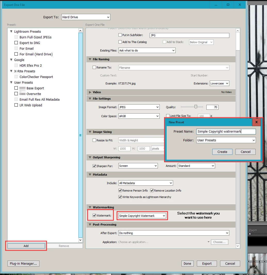 I created a preset under Edit. Under Edit Watermarks, I created a text water mark and saved it. When I exported the pictures, there were no presets to select. What do I need to do to make the presets appear?