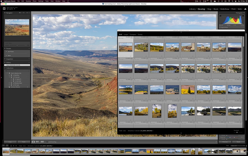 What still works, though, is pressing Shift+G so that Secondary Display grid appears over the Lightroom Classic application window on your single display, and pressing Shift+G again to reveal the application window again.