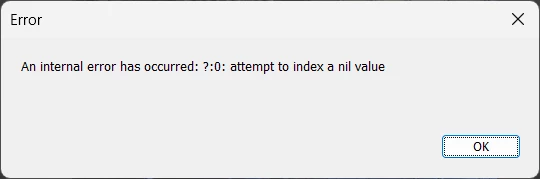 - Actual result: error message "An internal message has occured: ?:0: attempt to index a nil value"