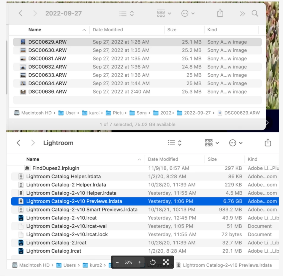 2. The total space occupied by the photos does not relate exactly to the space used by the catalog or it's associated preview folders. Looking again at that first screenshot, but the lower portion of it, the folder the catalog is in. Previews for one can eat a lot of space up. More than the photos. See other members replies above on that.