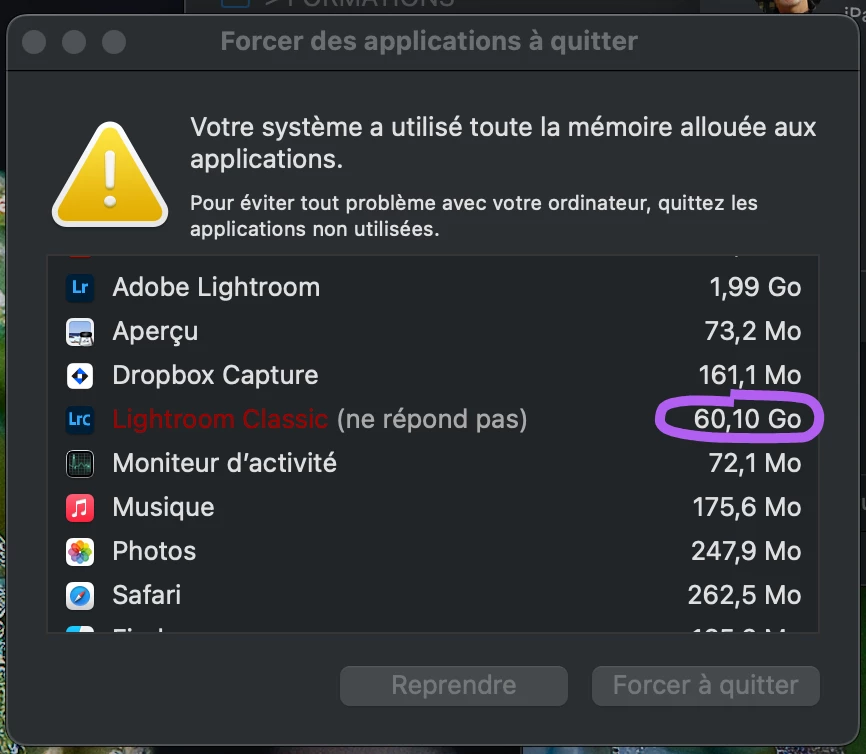 However, I limited the memory cache to 10GB and the video cache to 10GB as well. The phenomenon happens even if I don't work on LrC : it just needs to be launched. I see a usage of more than 60GB memory which is considerable.