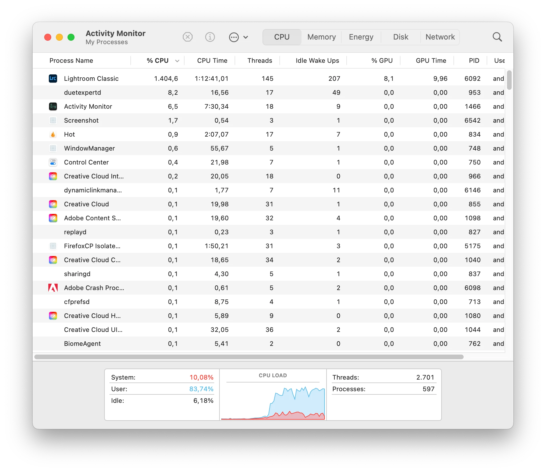 Real memory used by Lightroom: 1.730,5 MB (10,5%)