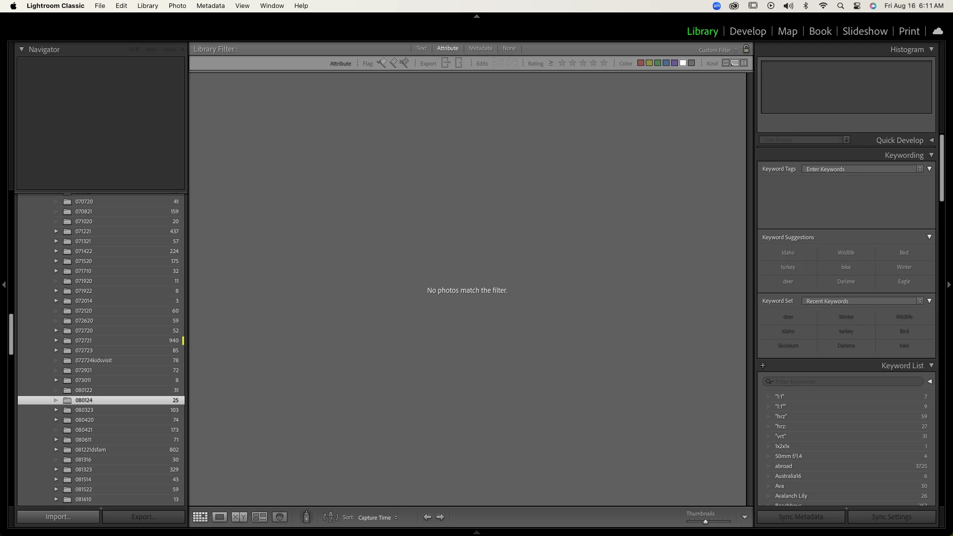 When I'm in Lightroom Classic and choose to use the Attribute_Virtual Copy filter I get this message "No photos match this filter". I use this all the time and just noticed it stopped working yesterday. I, at first, thought it was due to this being in a new folder but, when I went to old folders and tried the filter it didn't work on them either. I rebooted the Mac and tried it again but, this filter still doesn't work. After doing all my "post" on a shot, I always make a virtual copy of it, so when I am done working on photos in a folder I can just apply this filter and "export with presets" the result.