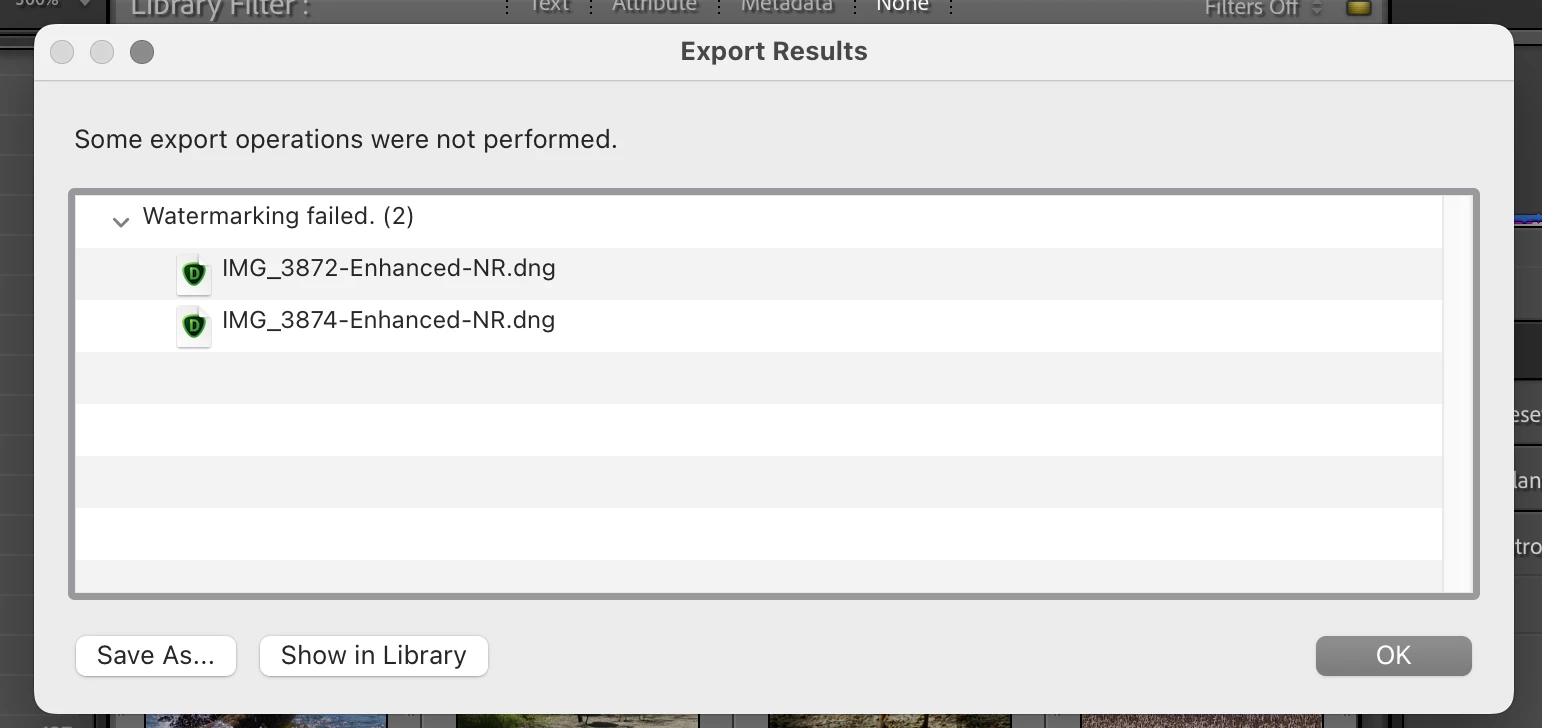 Hi there, after using the new denoise feature in 12.3 on a raw image, I'm unable to export to .jpg with a watermark. The error is: "Some export options were not performed. Watermarking failed."