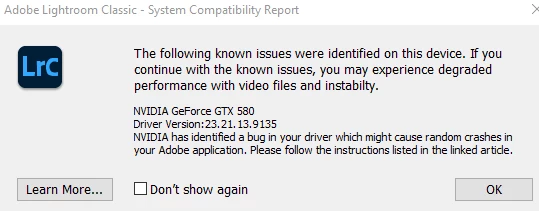 I installed LR CC 13.5.1 and it does run but I do get a warning message at startup stating my system is now unsupported. When I go into this version's performance page, the choice to use my Nvidia card is greyed-out.