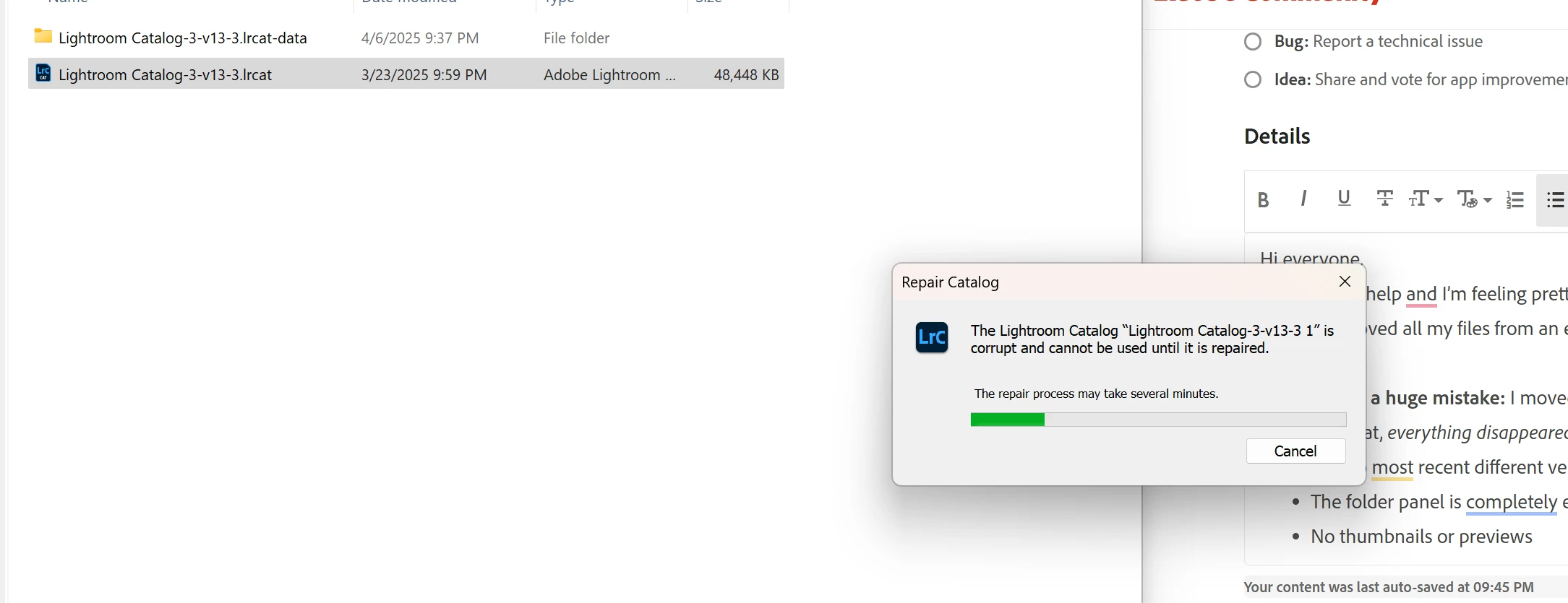 And now it’s worse: When I try to open the most recent catalog (which I think is a backup), Lightroom (v13.3.1 — I believe the latest) won’t open it at all. It says the catalog is corrupted and needs to be repaired. But after the repair process runs, the file still won’t open — it just fails silently.