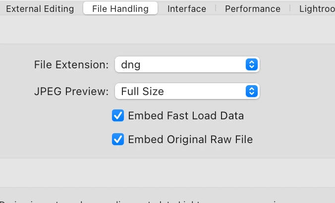 I'm thinking I kind of know, as it has been explained somewhat to me in my questions on this subject here, but fact is, I really do not know for sure. I think the file type reference is just what it says and choose between all caps and all lowercase and DNG means nothing... but that is what I think and I do not know if there is more implication. My main question is in the next choice for Library Preview as I've seen discussions on this that go into outer space with complexity about 'sidecars' or 'embed RAW' and the like. I really need the authorized version in straightforward and clear language to get a grasp on just this one menu and the choices that are offered. The Library previews are very important to me so I'm asking here for more help to get a good grasp on this subject.