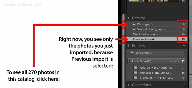 The only reason it looks like photos disappeared is that Lightroom is currently showing you only the photos you just imported. At any time, you can click anything on the left side — a folder, a collection, Previous Import, or All Photographs — and you will see that no photos have been lost, they are all there.