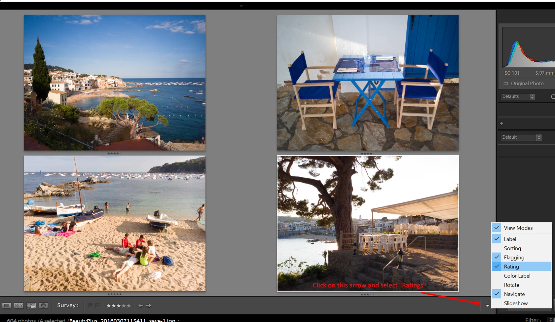 I use it to cull my images. How do I turn the rating back on while in survey view? It was there before and has suddenly gone? I usually select 4 images a t a time and then star images I'm keeping. The stars are not under the images in survey like they used to be. I'm using LR4