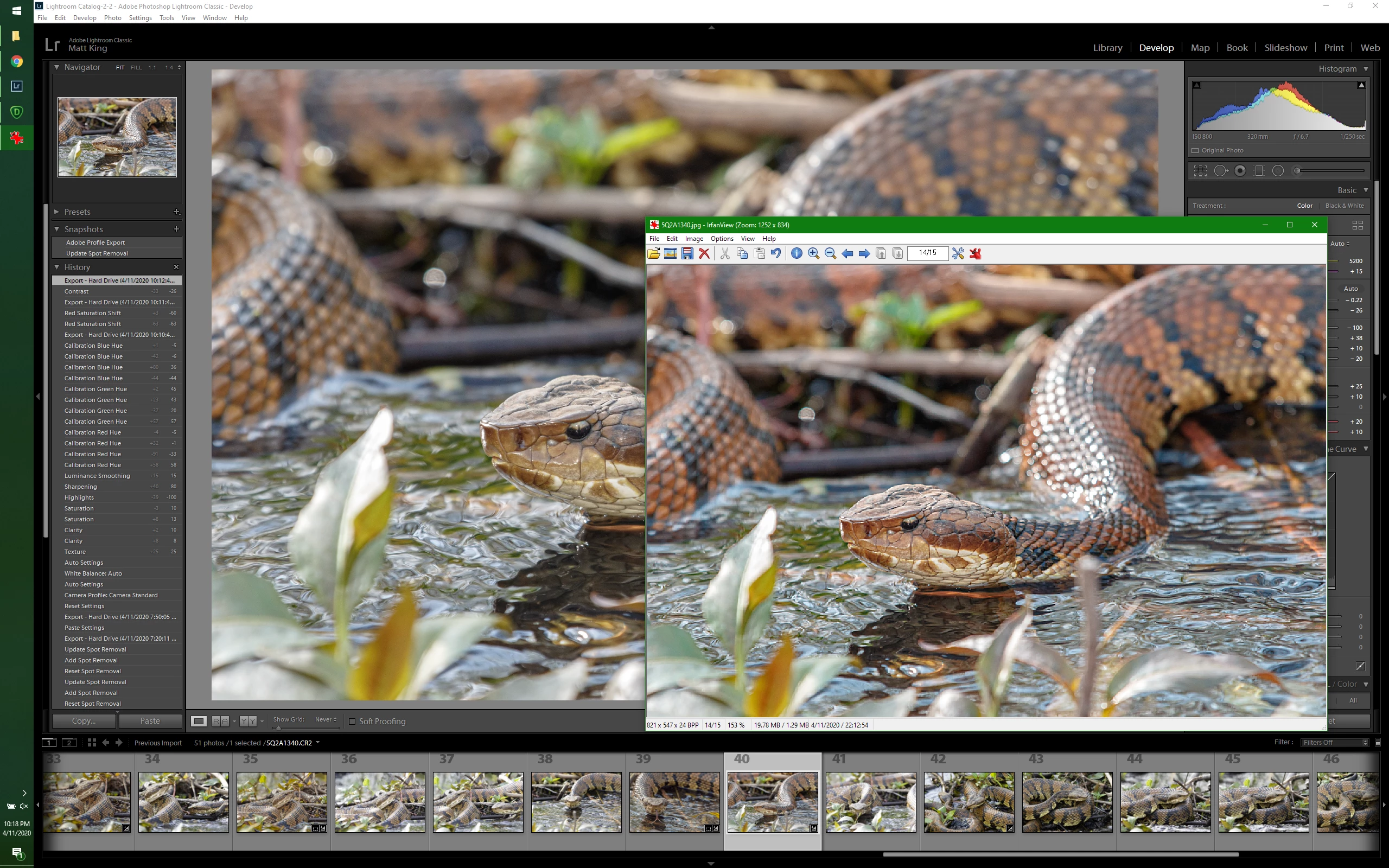 So for the past several months, I've been having a lot of trouble with my output JPGs not really matching the color in lightroom. Blues have been darker and contrastier, and reds have been blown out everywhere. All of my browns are red. I want to say this started sometime around November, but that doesn't mean a lot since I'm pretty bad about updating software - I am up to date right now though with the comparison shot below. What you can't see there is that the red saturation in lightroom is turned DOWN 60%.