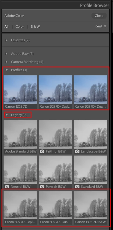 Yep, I expect 'Legacy' will cause confusion for a while. This segment contains B&W 'interpretations' of the old 'Adobe Camera' profiles (not to be confused with the 'Camera Matching' profiles) and any custom created profiles. Only the colour versions of these profiles actually exist.