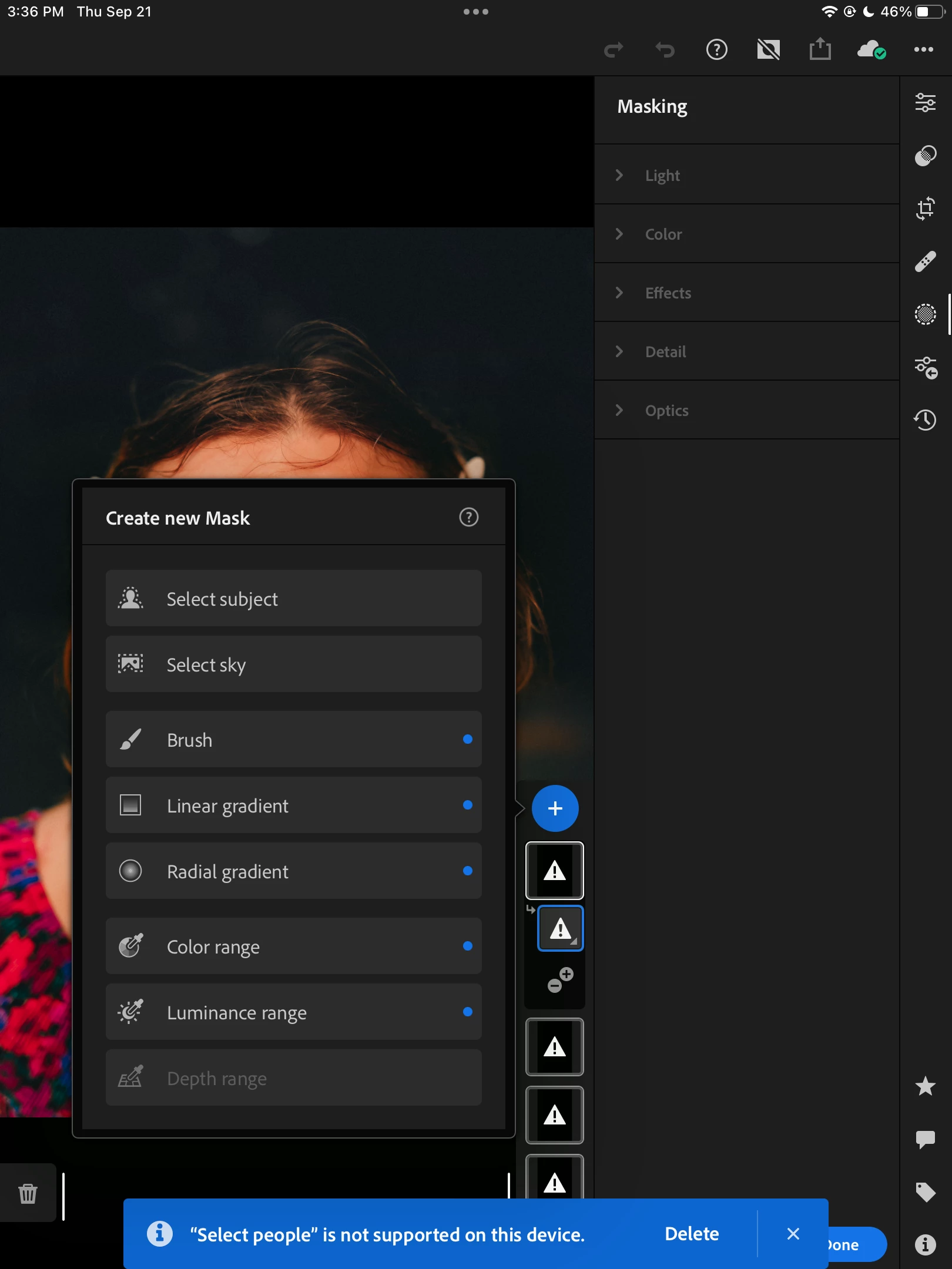 I was using "Select person" in masking just a few weeks ago on my iPad, now all of a sudden that option is unavailable. I also do not see adaptive portrait presets anymore. If I go to a photo I previously used an adaptive portrait on, I can still see the masking layers (see 1st photo IMG_0005). If I try copying those onto a different photo I get the message "Select people is not supported on this device." (see 2nd photo IMG_0006). Was this feature removed from iPad? I have a subscription to Lightroom mobile and can still use these features on my iPhone, just not my iPad. I've tried uninstalling and reinstalling with no change.