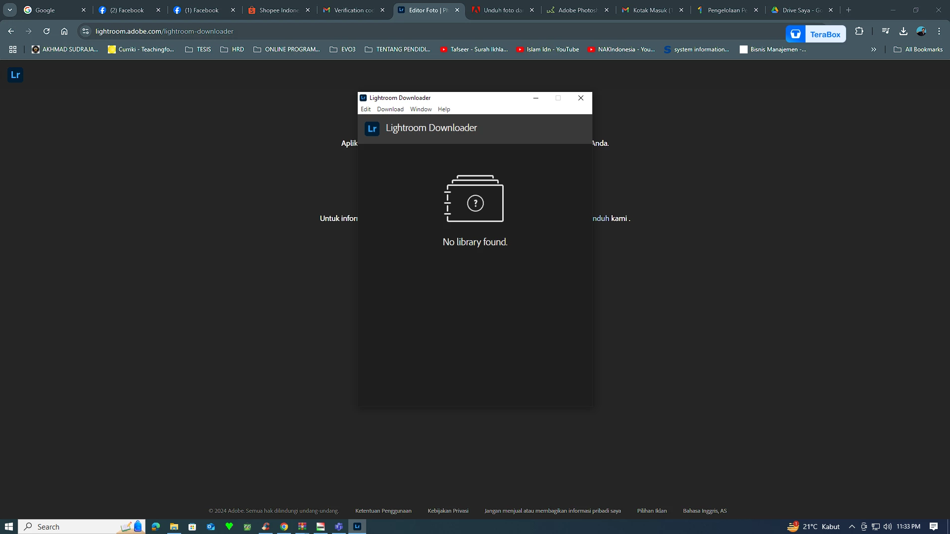The Adobe Lightroom Downloader installation process stops with the message 'no library found'. Has anyone experienced this?