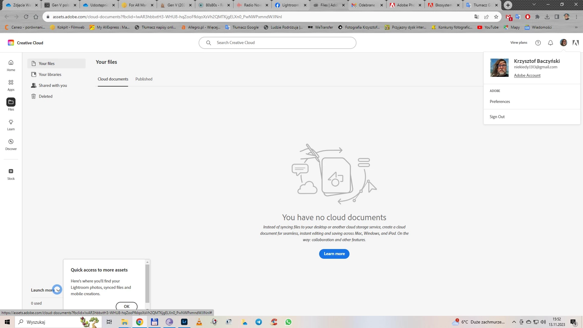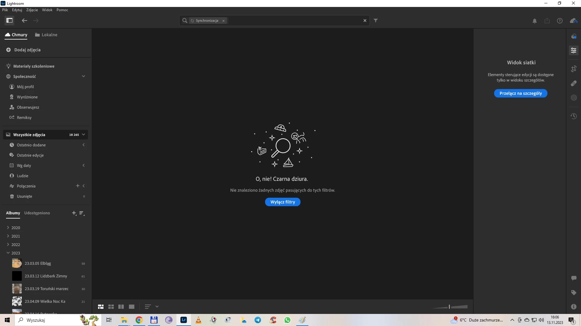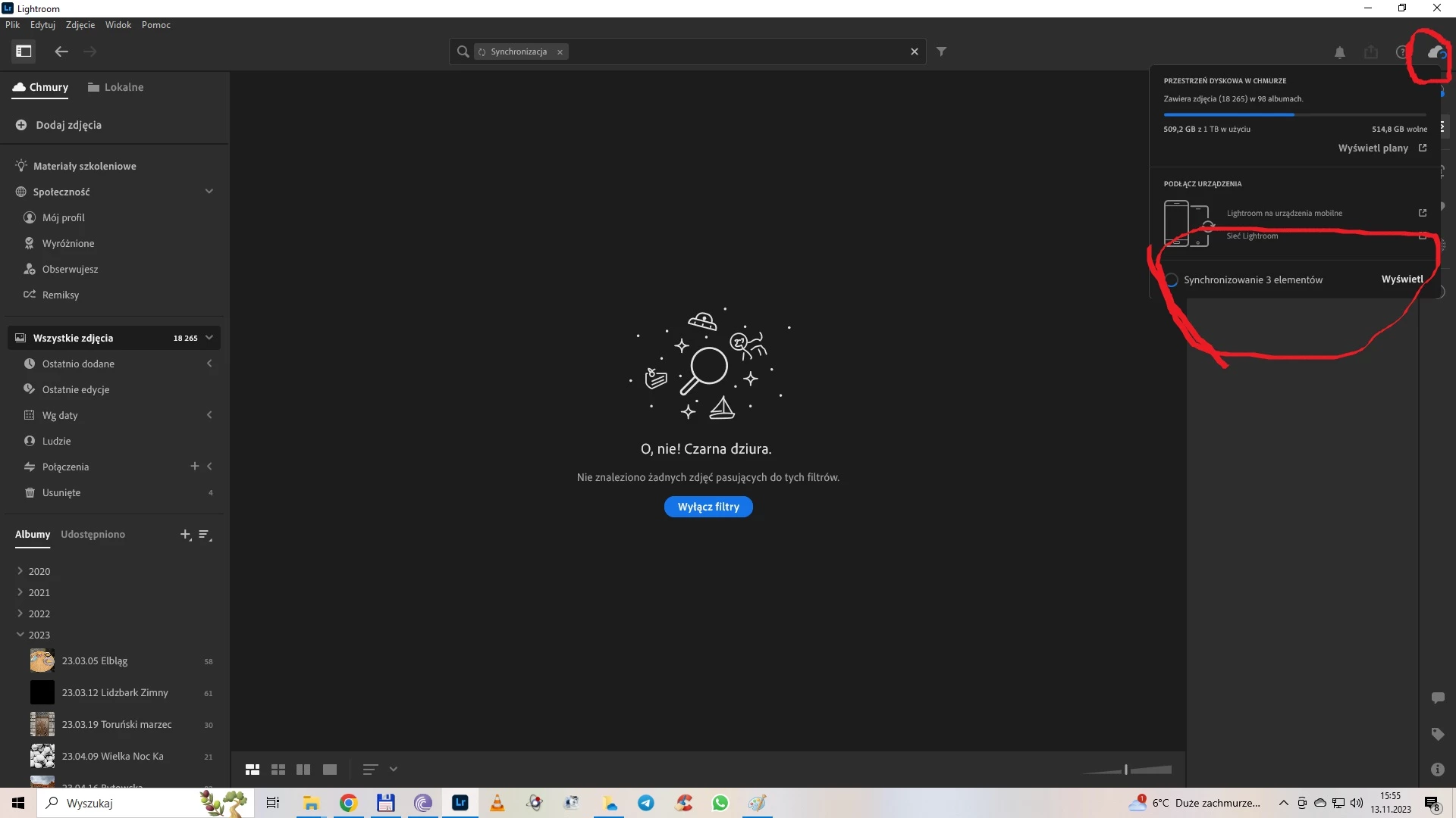 After installing Lightroom pchotoshop on a computer with Windows 10 and a laptop with Windows 11, after synchronization, a blue circle and the message "synchronizing 3 files" have been spinning for a few days. Online help did not help. The browser version does not see the problem and does not synchronize. I don't have any files in Creative Cloud (???). Logging out doesn't help. After displaying a preview of the attempted synchronization of 3 files, a window opens with an album containing over 100 photos. I have 500 GB of cloud space and about 18,000 photos.