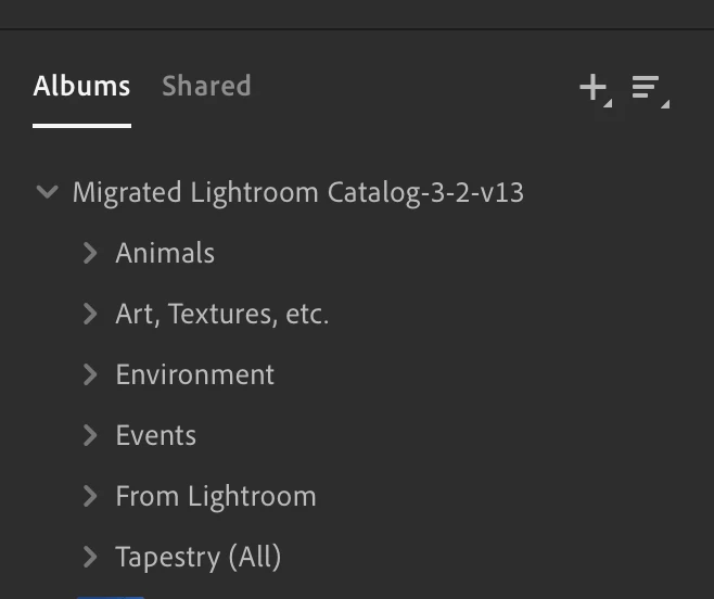 I have just migrated from Classic to LR CC. In the left tab I have as the 'root' album/folder "Migrated Lightroom Catalog-3-2-v13". Within that I also have a album "Lightroom Catalog-3-2-v13" and another just called "Lightroom". The latter have differing anumber of photos in them.