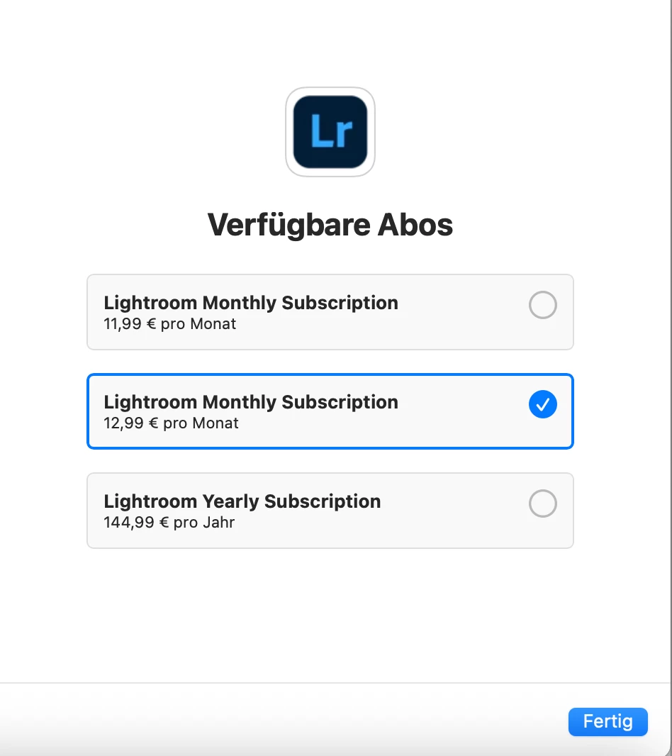 I am currently using Lightroom with a subscription via the Apple App Store.