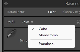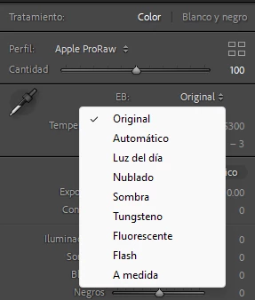 Only Adobe Color and Monochrome are shown. Additionaly, all options of White Balance are not available (only Automatic, Original and Custom).
