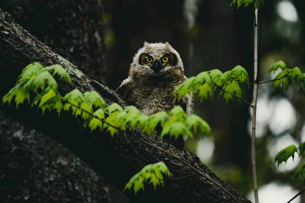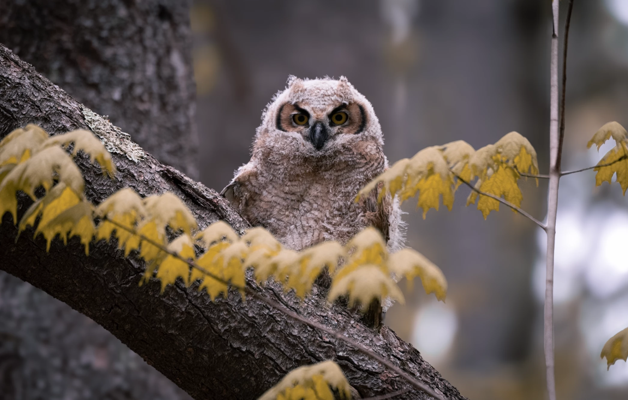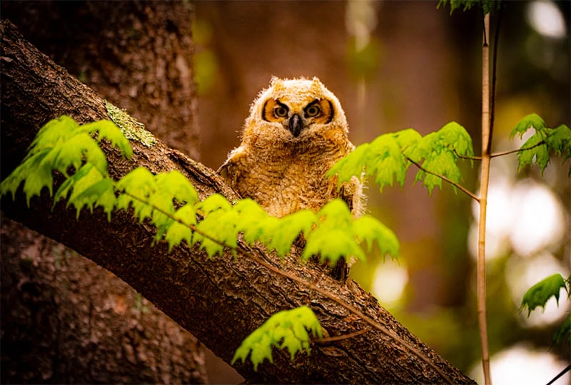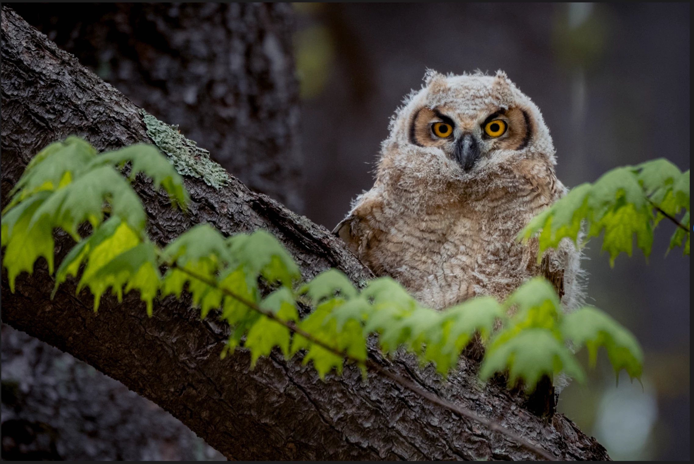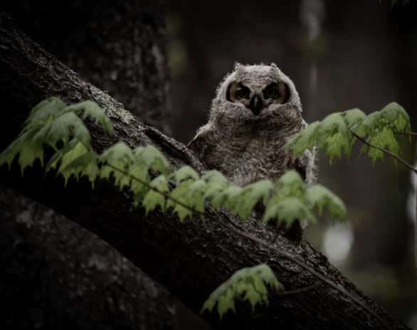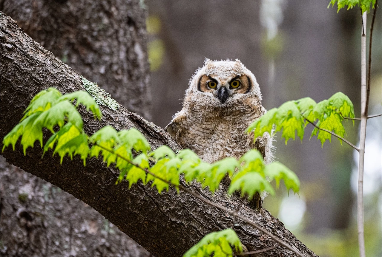 The Fledgling Great Horned Owl (Bubo virginianus) is an endearing, young version of one of North America’s most iconic raptors. At this stage of its life, the fledgling is transitioning from its early, downy plumage to the adult feathers that will eventually give it the unmistakable, regal appearance of its species. These owls are most famous for the "horn-like" tufts of feathers on their heads, which, while present in adults, are not as prominent in the young. Instead, fledglings tend to have softer, fluffier feathers, often with a mix of gray, brown, and white down that provides camouflage in their natural woodland and forested habitats.