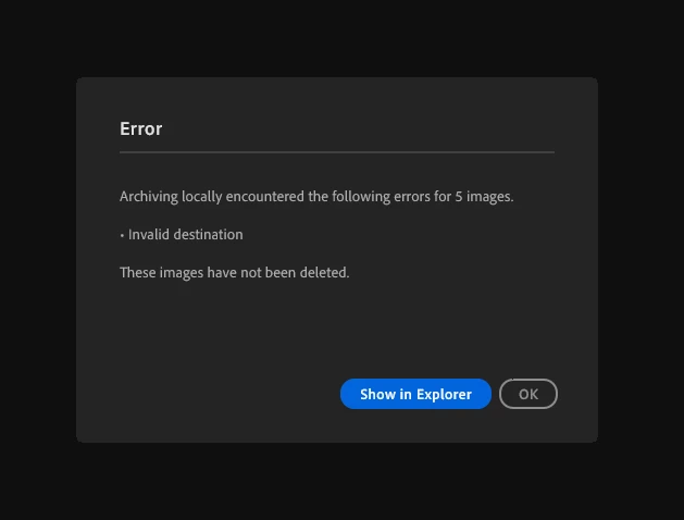 Archiving locally encountered the following errors for X images. Invalid destination.