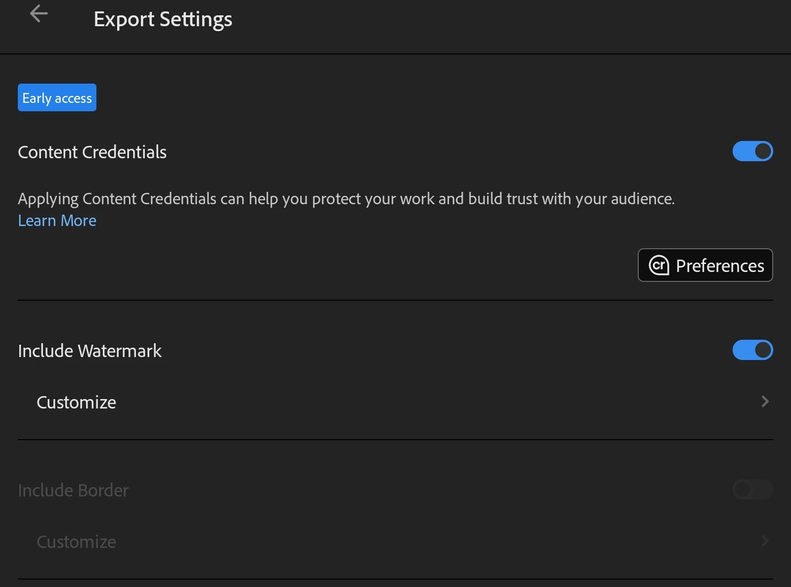 The border customisation that appear once you select watermark is no longer selectable with this rev 10.4.3. However the worse part is even if you deselect watermark and share or save to device the photo, it adds in the border from the previous setting ie width and color..