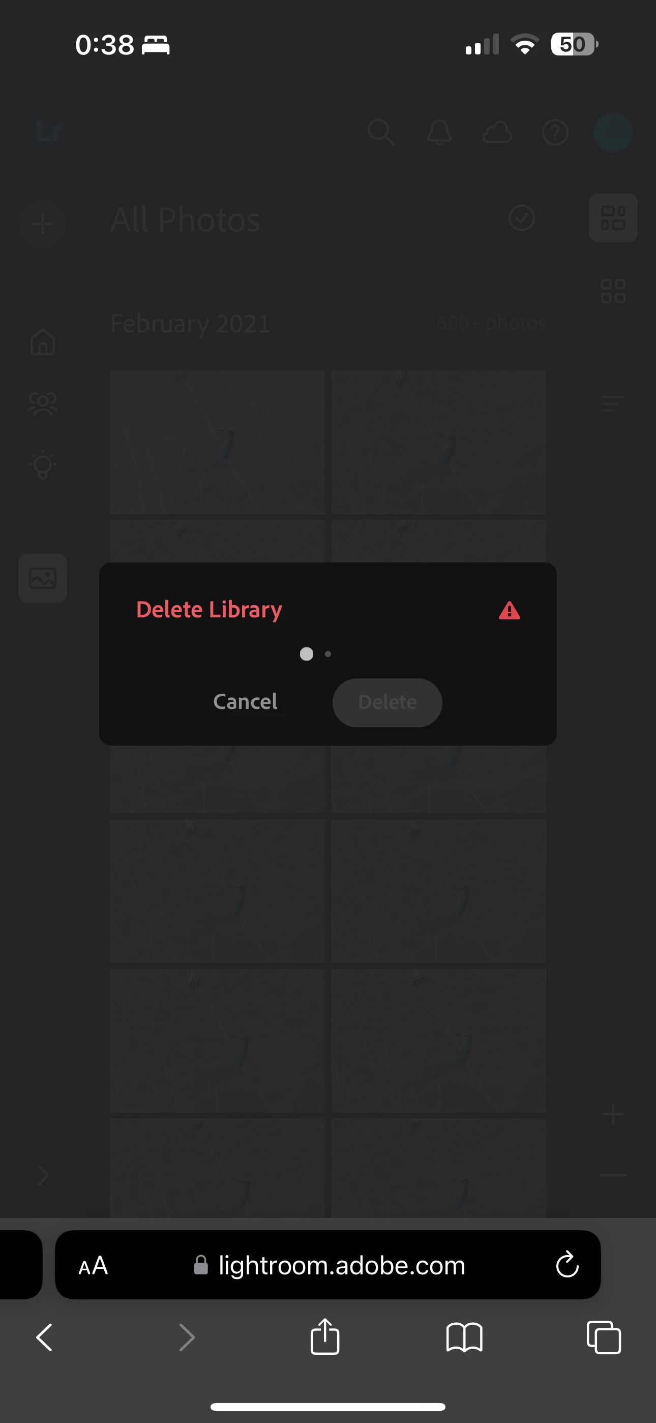 I've been having a lot if problems syncing after updating to the newest version of Lightroom classic and after trying many different things have decide to just start again from scratch. The problem is when I go to Lightroom web and click on my account tab to delete my synced library it gives me the box which says Delete Library at the top, a loading bar with three circles and a cancel/delete button. The circle loading bar goes for a few seconds then time out and the delete button is left grayed out and the only option is to click cancel. I've attached a photo of what it looks like. I normally use Lightroom classic on the Mac but am currently away from it so I took the photo from my phone while accessing Lightroom web.