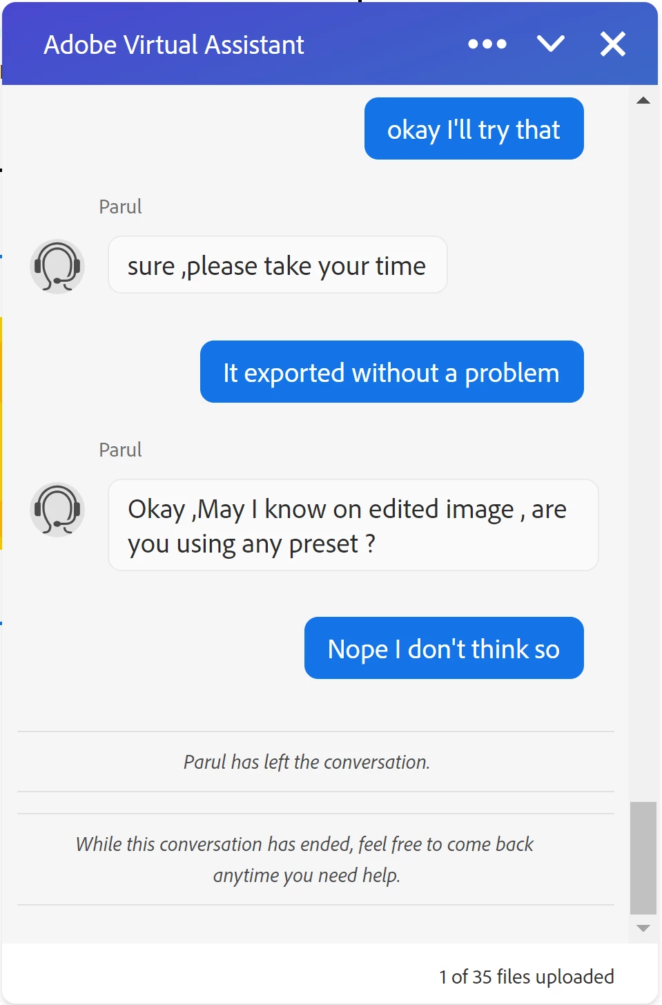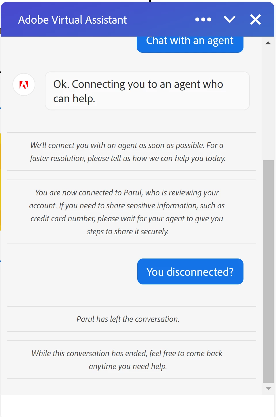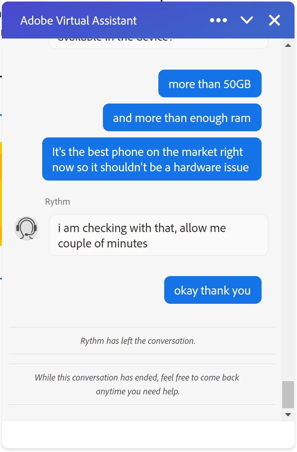 I've spoken with 5 support agents now via chat and every. single. one. has just left in the middle of the chat. Not disconnected, just left. I have screenshots of this and I cannot get anyone to actually see the issue through.
