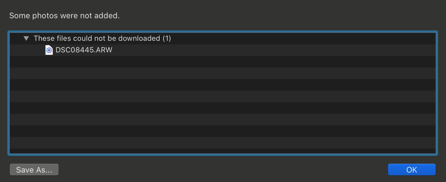 I can't import any images from my usual SD card, if I go to add > Connected Devices > SD card and select the images from the import previewer. I can preview and select images fine, but when I click add, I get the error "These files could not be downloaded".
