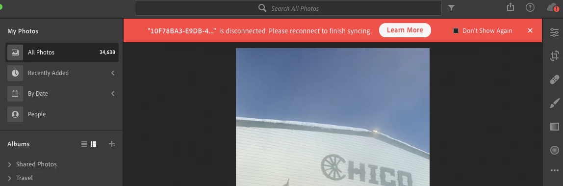 Can't resolve file is disconnected. Please reconnect to finish syncing - Lightroom