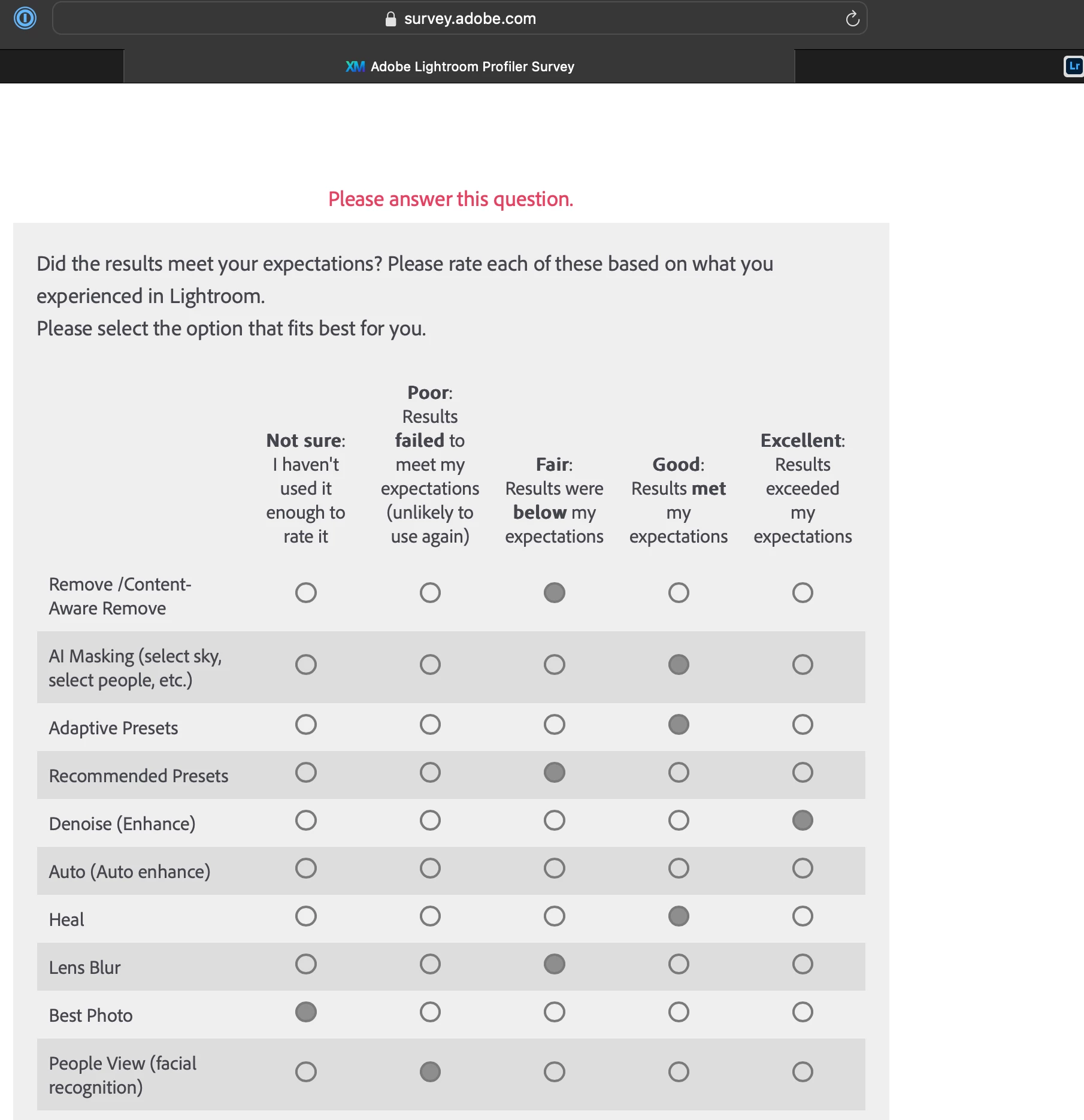 Cannot complete Adobe Lightroom Profiler Survey: "Please answer this question."