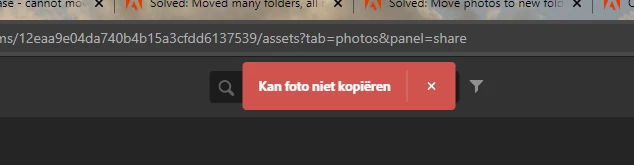I am trying to move my photographs from my current (private) account to my new account (for use at the office) but I get an error (see attachment, its in Dutch tho. It says: cannot copy the photo). I'll try explaining this as specifically as possible.