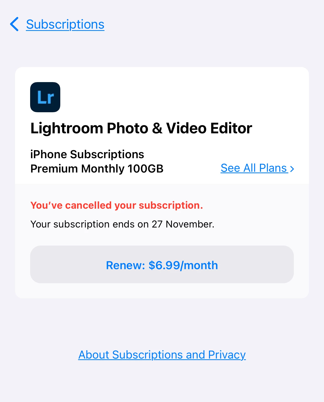 I have installed this Lightroom app and subscribe to it. Upon checking that it can't serve the purpose I deactivated the plan on the same day while I was on free trial. Yesterday I have been robbed by the company. And now when I am deleting my account, it says that I must first cancel the active substitution. When I go to cancel the subscription it only says RENEW.