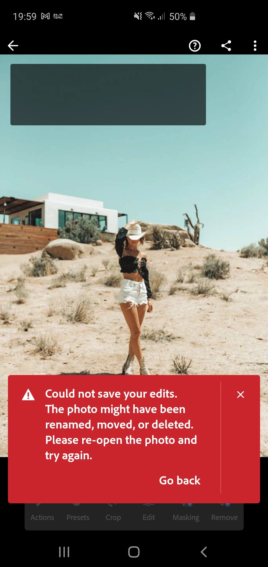I’m facing an issue in Lightroom where I can’t save my edits. The error message says: "Could not save your edits. The photo might have been renamed, moved, or deleted. Please re-open the photo and try again.
