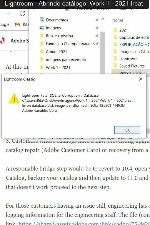 after reading your posts and understand what could be wrong, I uninstalled the version 11 and have reinstalled the version 10.4. After this, Lightroom tried to open the Catalog, but another error message appeared: