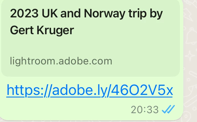 When I share a photo album in Lightroom iOS with people using the link option it sometimes displays the cover photo in the WhatsApp link and sometimes do not show the cover photo What can I do to rectify this so the link and the cover photo both show on a the WhatsApp message. Refer screenshots. Album underlying settings are exactly the same