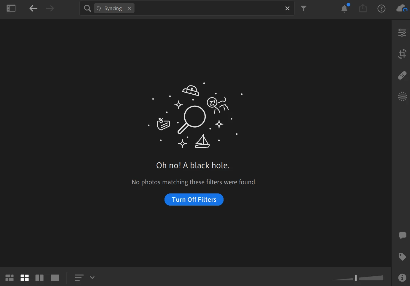 Lightroom says I have 1 photo syning and it never finishes. When I click on "View" to see what it is, there are no photos to view.
