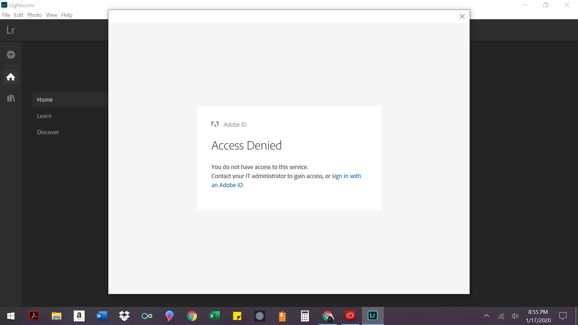 I have no problem signing in to the cloud version of the lightroom but when I try to sign in the desktop version I keep getting this error. I have tried uninstalling and reinstalling the apps, the cloud, reach out to customer service through messaging and was on hold on the phone for an hour.....what gives?