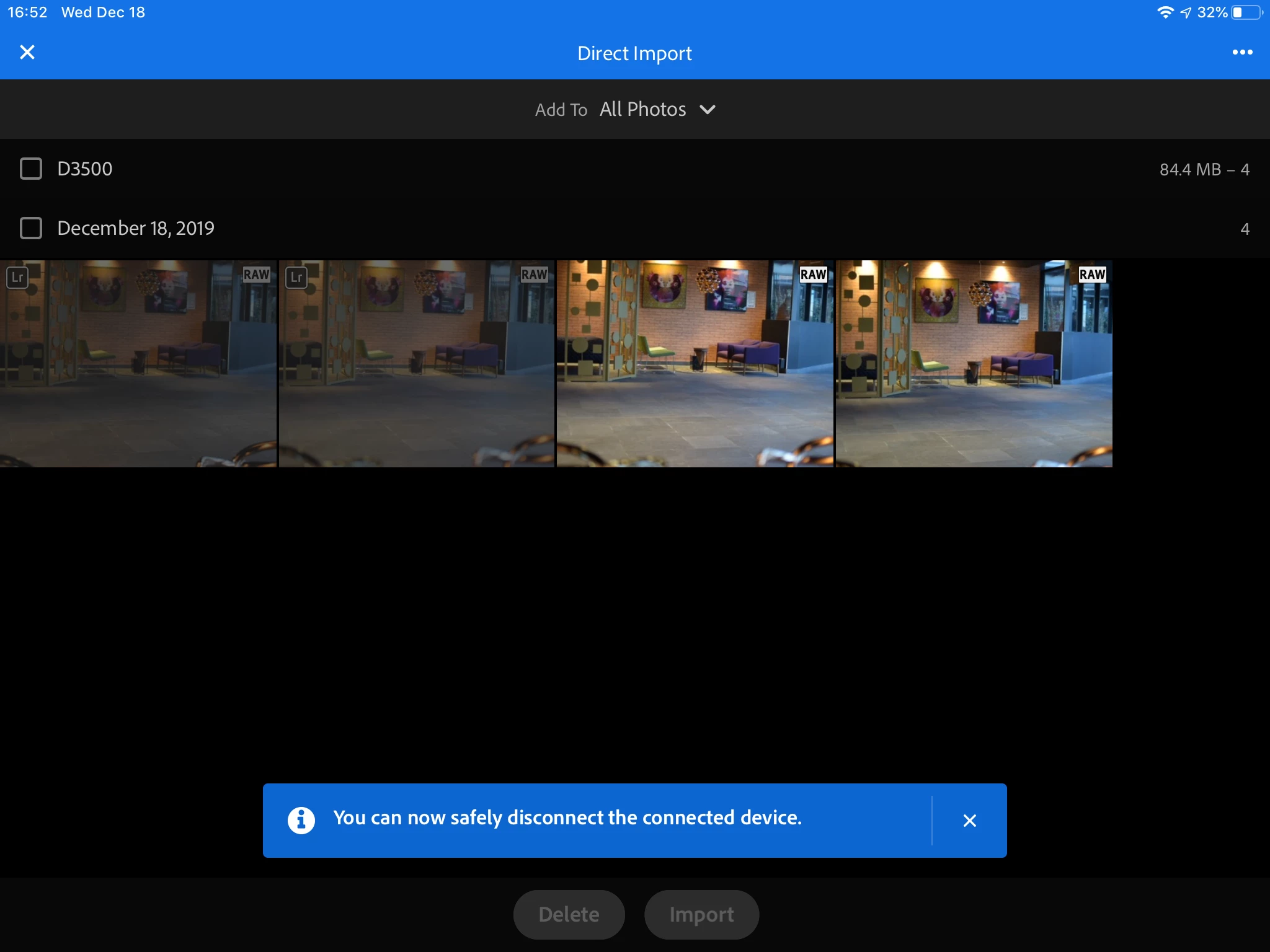 1- Lightroom detected when I connected the camera the device and everything went smoothly, it seemed to be importing all my RAW files.