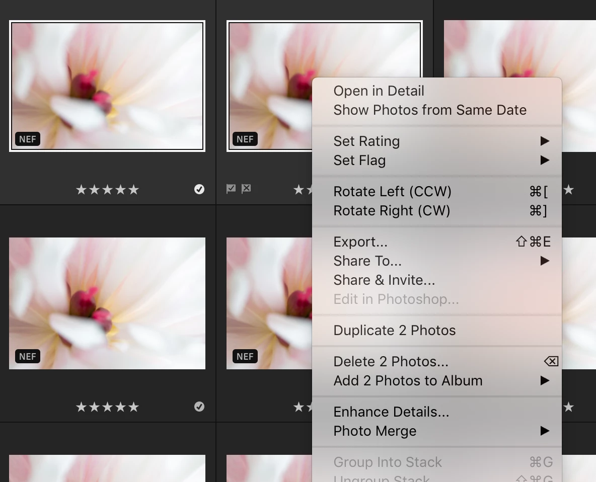 I'm trying to do a stack (84 raw images, if number or size is the issue?) of a macro flower. I used my Nikon's focus shift feature, uploaded the images into Lightroom, but the File > Edit in Photoshop is greyed out, although it's installed and open on my 2019 Macbook Pro. The Edit in Photoshop option stays grey even if I'm only selecting one image. The Export to Photoshop from the "Photos" option at the top of the screen doesn't seem to be available in my version of Lightroom. Right clicking on the images doesn't seem to give me the option either.